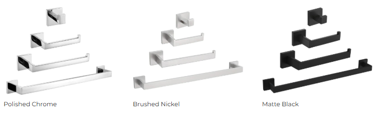 With sleek lines and a modern edge, this 4-piece bath accessory set brings timeless style and everyday luxury to your remodel. Includes a robe hook, single towel bar, towel ring, and toilet paper holder — the perfect finishing touches for a polished bathroom.